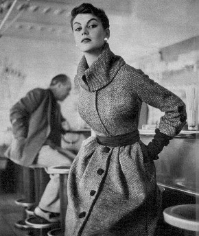 [Tess is warm everywhere but her calves, but that's just how the fashion of the time goes: flared wool coat with its tiny tailored waist, a crisp dress falling to mid-calf with a petticoat underneath for warmth, and cute ankle-high boots. Nylons don't do much for the cold, and the only pants in her wardrobe are obviously meant for summer weather and thus pretty useless. Oh well, though, there's not much you can do about it, and at least this is better than Florence. At least here she has underwear, even if it does come with way more straps than necessary.